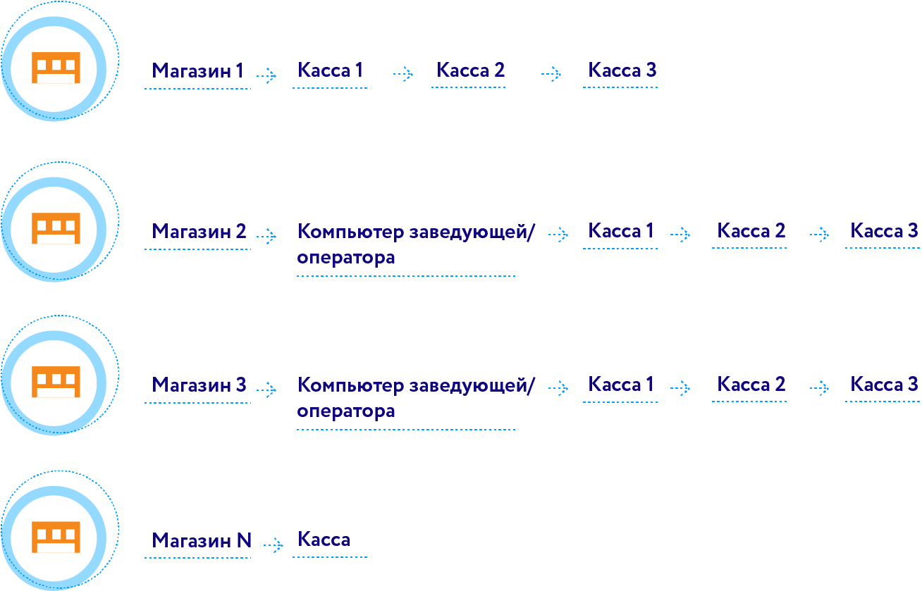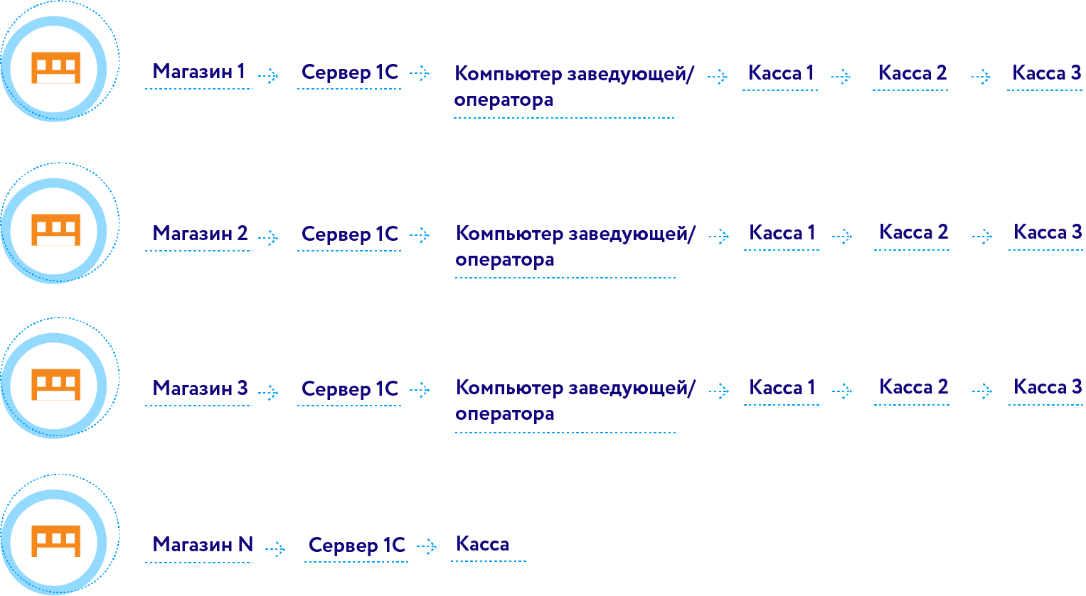 Оптимальное решение: при использовании облачного хаба магазины начинают работать в едином информационном пространстве с центральным офисом. Соединение основано на OpenVPN, информация шифруется при передаче через открытые каналы. Облачный хаб хорошо зарекомендовал себя при работе с кассами Дримкас Viki, АТОЛ, Штрих. При дальнейшей работе возможно несколько сценариев. Первый сценарий предполагает полный отказ от компьютерного оборудования в магазине и централизованное управление. Цены, остатки передаются из центрального офиса в кассу, а загрузка производится из интерфейса кассовой программы.